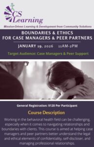 Working in the behavioral health field can be challenging, especially when it comes to navigating relationships and boundaries with clients. This course is aimed at helping case managers and peer partners better understand the legal and ethical elements of confidentiality, self-discloser, and managing professional relationships.