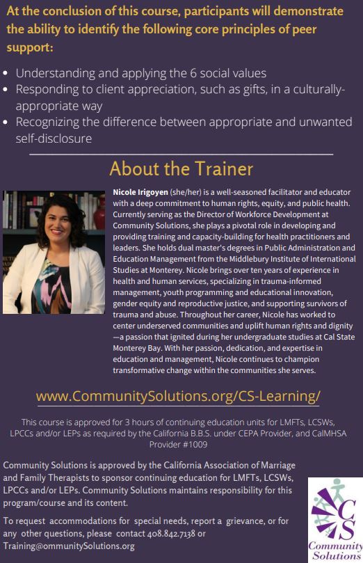 Community Solutions is approved by the California Association of Marriage and Family Therapists to sponsor continuing education for LMFTs, LCSWs, LPCCs and/or LEPs. Community Solutions maintains responsibility for this program/course and its content.