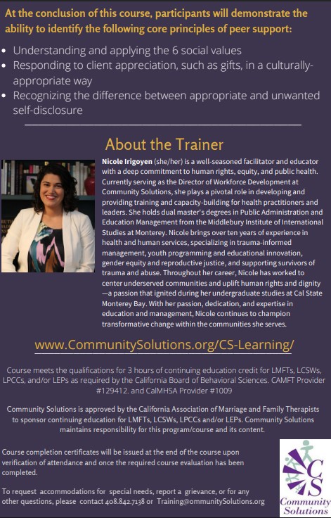 Community Solutions is approved by the California Association of Marriage and Family Therapists to sponsor continuing education for LMFTs, LCSWs, LPCCs and/or LEPs. Community Solutions maintains responsibility for this program/course and its content.