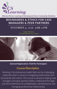 Working in the behavioral health field can be challenging, especially when it comes to navigating relationships and boundaries with clients. This course is aimed at helping case managers and peer support specialists better understand the legal and ethical elements of confidentiality, self-disclosure, and managing professional relationships.