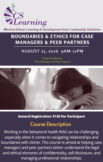 Working in the behavioral health field can be challenging, especially when it comes to navigating relationships and boundaries with clients. This course is aimed at helping case managers and peer partners better understand the legal and ethical elements of confidentiality, self-discloser, and managing professional relationships.
