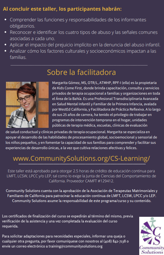 Esta capacitación GRATUITA proporciona a los informantes obligatorios de abuso infantile conocimientos esenciales sobre sus responsabilidades y su papel crucial en nuestra comunidad. Los participantes aprenderán a identificar los cuatro tipos de abuso – físico, emocional, sexual y negligencia – a la vez que exploran el impacto de los prejuicios culturales y los factores socioeconómicos en las familias. Mediante conversaciones interactivas, los asistentes desarrollarán las habilidades necesarias para reconocer y responder eficazmente a las señales de abuso, garantizando un entorno más seguro para los niños. Este taller cumple con los requisitos del estado de California para informantes obligatorios, de conformidad con la Ley de Denuncia de Abuso y Negligencia Infantil (CANRA).