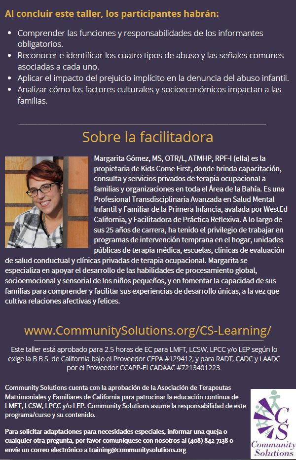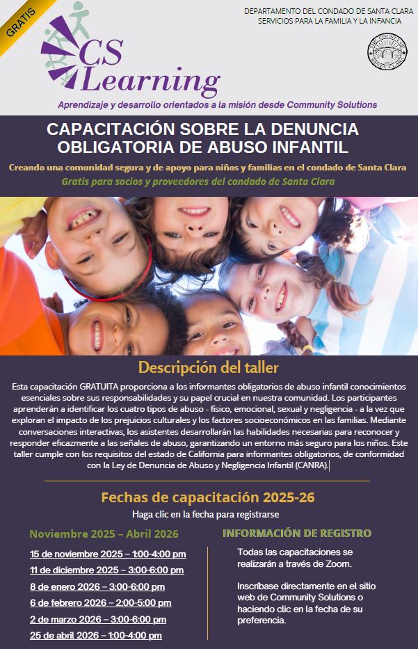 Esta capacitación GRATUITA proporciona a los informantes obligatorios de abuso infantile conocimientos esenciales sobre sus responsabilidades y su papel crucial en nuestra comunidad. Los participantes aprenderán a identificar los cuatro tipos de abuso – físico, emocional, sexual y negligencia – a la vez que exploran el impacto de los prejuicios culturales y los factores socioeconómicos en las familias. Mediante conversaciones interactivas, los asistentes desarrollarán las habilidades necesarias para reconocer y responder eficazmente a las señales de abuso, garantizando un entorno más seguro para los niños. Este taller cumple con los requisitos del estado de California para informantes obligatorios, de conformidad con la Ley de Denuncia de Abuso y Negligencia Infantil (CANRA).