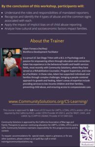 Target Audience: Individuals needing to meet legal responsibilities under California’s CANRA law, and open to the community wanting to learn about mandatory reporting requirements.