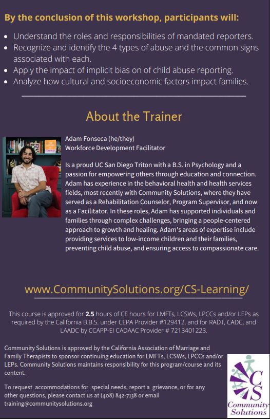 This FREE training equips mandated child abuse reporters with essential knowledge of their responsibilities and critical role in our community. Participants will learn to identify the four types of abuse—physical, emotional, sexual, and neglect—while exploring the impact of cultural biases and socioeconomic factors on families. Through interactive discussions, attendees will develop the skills necessary to effectively recognize and respond to signs of abuse, ensuring a safer environment for children. This course meets the CA state requirements for mandated reporters in compliance with the Child Abuse and Neglect Reporting Act (CANRA).