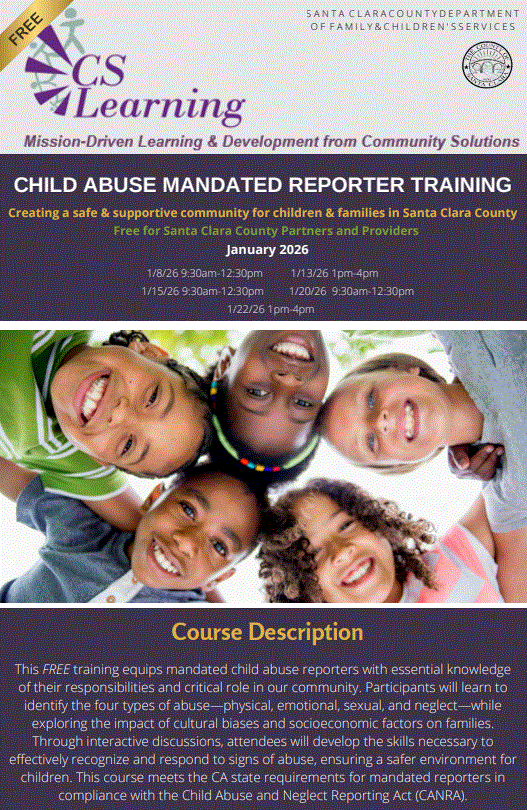 This FREE training equips mandated child abuse reporters with essential knowledge of their responsibilities and critical role in our community. Participants will learn to identify the four types of abuse—physical, emotional, sexual, and neglect—while exploring the impact of cultural biases and socioeconomic factors on families. Through interactive discussions, attendees will develop the skills necessary to effectively recognize and respond to signs of abuse, ensuring a safer environment for children. This course meets the CA state requirements for mandated reporters in compliance with the Child Abuse and Neglect Reporting Act (CANRA).