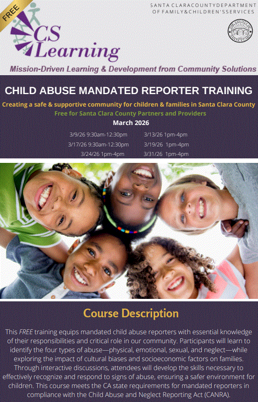 This FREE training equips mandated child abuse reporters with essential knowledge of their responsibilities and critical role in our community. Participants will learn to identify the four types of abuse—physical, emotional, sexual, and neglect—while exploring the impact of cultural biases and socioeconomic factors on families. Through interactive discussions, attendees will develop the skills necessary to effectively recognize and respond to signs of abuse, ensuring a safer environment for children. This course meets the CA state requirements for mandated reporters in compliance with the Child Abuse and Neglect Reporting Act (CANRA).