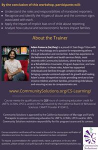 Target Audience: Individuals needing to meet legal responsibilities under California’s CANRA law, and open to the community wanting to learn about mandatory reporting requirements.