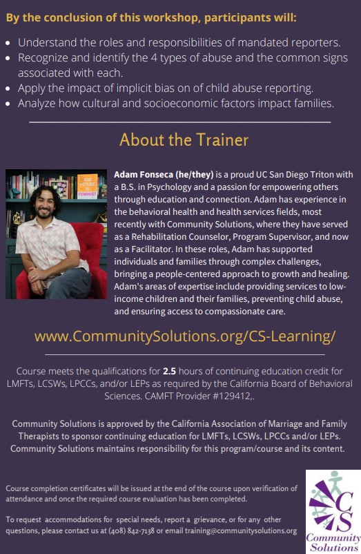 This FREE training equips mandated child abuse reporters with essential knowledge of their responsibilities and critical role in our community. Participants will learn to identify the four types of abuse—physical, emotional, sexual, and neglect—while exploring the impact of cultural biases and socioeconomic factors on families. Through interactive discussions, attendees will develop the skills necessary to effectively recognize and respond to signs of abuse, ensuring a safer environment for children. This course meets the CA state requirements for mandated reporters in compliance with the Child Abuse and Neglect Reporting Act (CANRA).