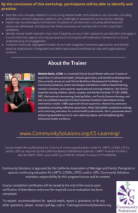 This course provides behavioral health professionals with foundational knowledge and clinical frameworks for understanding and addressing co‑occurring mental health and substance use disorders. Participants will review core concepts related to substance use disorders, including diagnostic considerations and assessment challenges, and explore a neuroscience‑informed model of addiction to better understand the mechanisms of chemical dependency and symptom overlap with psychiatric disorders.Â