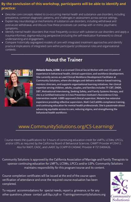 Melanie Davis, LCSW, is a Licensed Clinical Social Worker with over 15 years of experience in behavioral health, clinical supervision, and workforce development. She currently serves as Lead Clinical Workforce Development Facilitator at Community Solutions, where she designs and delivers evidence-based training, mentors clinicians, and supports organizational learning initiatives. Her clinical expertise serving children, adults, couples, and families includes TF-CBT, EMDR, DBT, Motivational Interviewing, Seeking Safety, and Family Systems therapy, and she is a Certified Instructor in Crisis Prevention Institute’s Nonviolence Crisis Intervention model. A BBS-approved clinical supervisor, Melanie has extensive experience providing reflective supervision, Medi-Cal/CalAIMs compliance training, and continuing education for mental health professionals. She is passionate about advancing equitable access to care, reducing stigma, and strengthening the behavioral health workforce.
