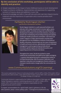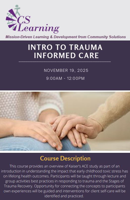 This course provides an overview of Kaiser’s ACE study as part of an introduction in understanding the impact that early childhood toxic stress has on lifelong health outcomes. Participants will be taught through lecture and group activities best practices in responding to trauma and the Stages of Trauma Recovery. Opportunity for connecting the concepts to participants own experiences will be guided and interventions for client self-care will be identified and practiced. This course is required for all Community Solutions employees.