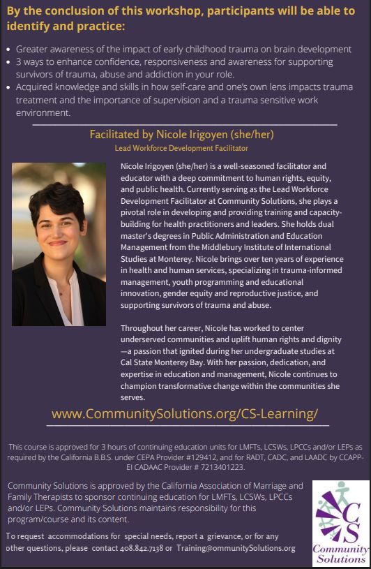 Community Solutions is approved by the California Association of Marriage and Family Therapists to sponsor continuing education for LMFTs, LCSWs, LPCCs and/or LEPs. Community Solutions maintains responsibility for this program/course and its content.