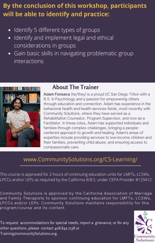 Community Solutions is approved by the California Association of Marriage and Family Therapists to sponsor continuing education for LMFTs, LCSWs, LPCCs and/or LEPs. Community Solutions maintains responsibility for this program/course and its content.