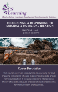 This course covers an introduction to assessing for and engaging with clients who are experiencing suicidal and/or homicidal ideation. It focuses on Joiner’s interpersonal theory of suicide and gives practical and actionable items for mental health professionals.