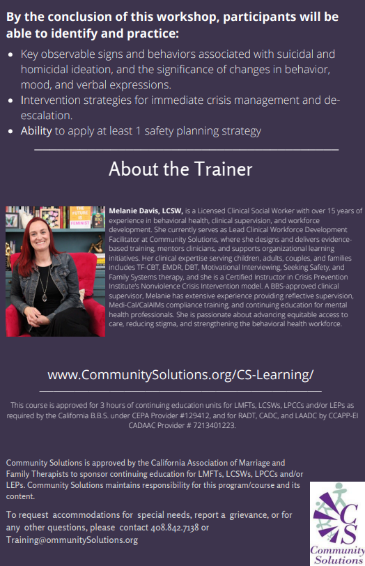 Melanie Davis, LCSW, is a Licensed Clinical Social Worker with over 15 years of experience in behavioral health, clinical supervision, and workforce development. She currently serves as Lead Clinical Workforce Development Facilitator at Community Solutions, where she designs and delivers evidence-based training, mentor’s clinicians, and supports organizational learning initiatives. Her clinical expertise serving children, adults, couples, and families includes TF-CBT, EMDR, DBT, Motivational Interviewing, Seeking Safety, and Family Systems therapy, and she is a Certified Instructor in Crisis Prevention Institute’s Nonviolence Crisis Intervention model. A BBS-approved clinical supervisor, Melanie, has extensive experience providing reflective supervision, Medi-Cal/CalAIMs compliance training, and continuing education for mental health professionals. She is passionate about advancing equitable access to care, reducing stigma, and strengthening the behavioral health workforce.