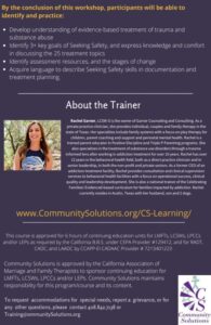 Seeking Safety is a core care model at Community Solutions, and is an evidence-based treatment for clients over age 18 who have experienced trauma and/or substance abuse. Seeking Safety teaches present-focused coping skills to help clients create a sense of safety in their daily lives. It is highly flexible and can be conducted with a wide range of clients, providers, and settings. Participants will engage in small group discussions, and role plays to develop an understanding of the 25 Seeking Safety treatment topics, each representing a safe coping skill relevant to both trauma and/or substance abuse, such as “Asking for Help”, “Creating Meaning”, “Compassion”, and “Healing from Anger.” In this training, we cover background on trauma and substance abuse (rates, presentation, models and stages of treatment, clinical challenges). Training will also include language to use in documentation and treatment planning.