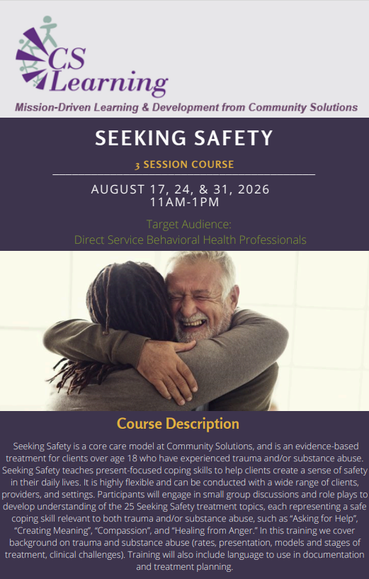 Seeking Safety is a core care model at Community Solutions, and is an evidence-based treatment for clients over age 18 who have experienced trauma and/or substance abuse. Seeking Safety teaches present-focused coping skills to help clients create a sense of safety in their daily lives. It is highly flexible and can be conducted with a wide range of clients, providers, and settings. Participants will engage in small group discussions, and role plays to develop an understanding of the 25 Seeking Safety treatment topics, each representing a safe coping skill relevant to both trauma and/or substance abuse, such as “Asking for Help”, “Creating Meaning”, “Compassion”, and “Healing from Anger.” In this training, we cover background on trauma and substance abuse (rates, presentation, models and stages of treatment, clinical challenges). Training will also include language to use in documentation and treatment planning.