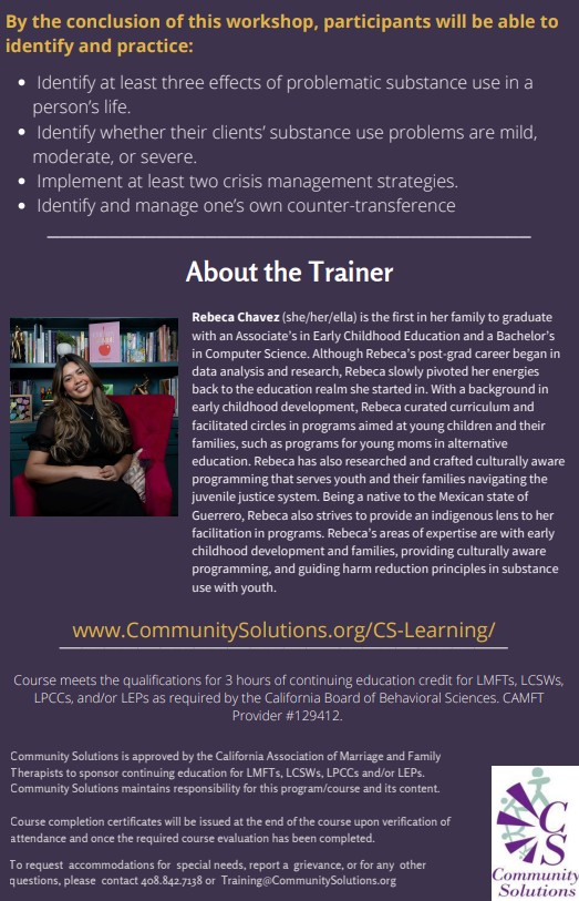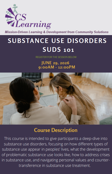 Cancelation Policy: Cancellations are requested at least 48 hours prior to the training day. Kindly email Trainings@communitysolutions.org to un-enroll from the training if you unable to attend after registration in order to receive a refund.