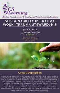 This course explores the profound impact of working in high-stress and high-trauma fields and offers strategies for sustaining well-being while engaging in meaningful work. Drawing from Trauma Stewardship: An Everyday Guide to Caring for Self While Caring for Others by Laura van Dernoot Lipsky, this training examines how secondary trauma accumulates over time and articulates the 16 signs of trauma exposure response, while offering practical ideas for personal and professional sustainability.