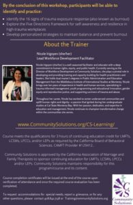 Cancelation Policy: Cancellations are requested at least 48 hours prior to the training day. Kindly email Trainings@communitysolutions.org  to un-enroll from the training if you unable to attend after registration in order to receive a refund.