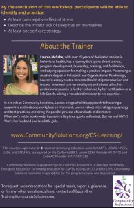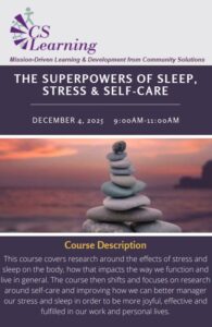 This course covers research around the effects of stress and sleep on the body, how that impacts the way we function and live in general. The course then shifts and focuses on research around self-care and improving how we can better manager our stress and sleep in order to be more joyful, effective and fulfilled in our work and personal lives.