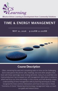 Often, remaining focused and completing tasks on time can be challenging due to disruptions like phone calls, meetings, text and other people crises. Even with these seemingly never-ending demands, many of us could feel a lot more productive if we increased our self-management skills when it comes to where we focus our time and energy. In this course, you’ll will develop a basic understanding of time management skills by learning techniques to help recognize the most common distractions and how to best react in these “moments of choice”. Mastering time & energy management helps us reach our goals and reduce stress.
