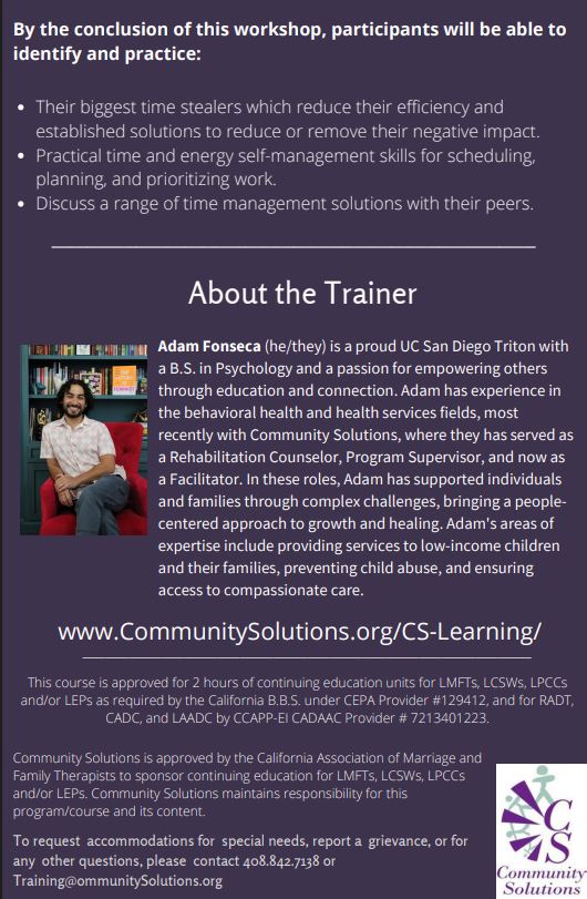 Community Solutions is approved by the California Association of Marriage and Family Therapists to sponsor continuing education for LMFTs, LCSWs, LPCCs and/or LEPs. Community Solutions maintains responsibility for this program/course and its content.