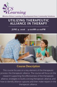 This course focuses on a key element of the therapeutic process: the therapeutic alliance. The course will focus on the research supporting the effectiveness of the therapeutic alliance, strategies to build a strong therapeutic alliance, and how to identify alliance ruptures and then make repairs in the therapeutic alliance.