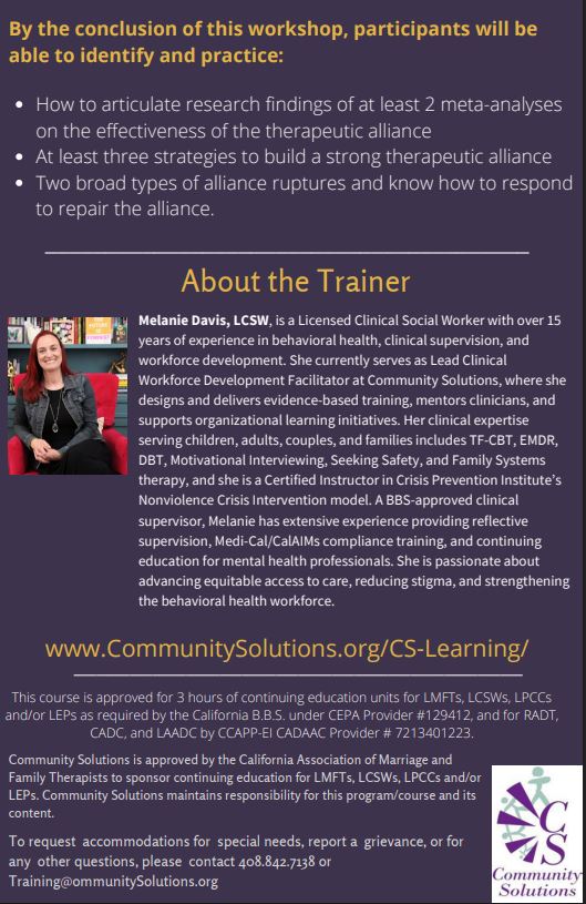 Community Solutions is approved by the California Association of Marriage and Family Therapists to sponsor continuing education for LMFTs, LCSWs, LPCCs and/or LEPs. Community Solutions maintains responsibility for this program/course and its content.